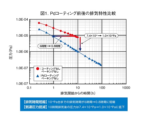 その結果Pdコーティングにおいては排気時間が約1/7に短縮され、またPd/Tiコーティングにおいては排気時間が約1/5に短縮され、到達圧力が1桁低下しました。この排気時間の短縮により、サイクルタイムが短縮され生産性向上されることが期待されます。また、大気リークを繰り返しても排気特性は変わらないことを確認しております。