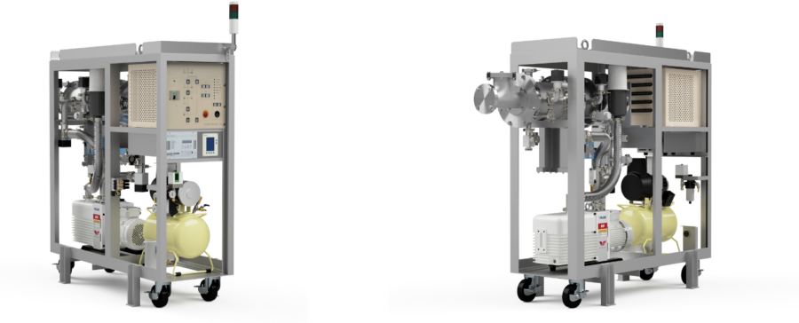 今回超伝導電磁石用クライオスタットの真空断熱層排気用に納入させていただいた高真空排気装置は、オイルフリーでメンテナンスフリーな磁気軸受形で、10-6Pa以下の超高真空まで排気可能な1000 L/sクラスの複合分子ポンプであるTG1300Mを主ポンプとし、経済的で信頼性の高い1000 L/minクラスの2段式油回転ポンプVRD65を荒引/補助ポンプとした構成になっています。装置は可搬式であり、ポンプ等の機器一式は車輪のついたカートに取り付けられています。ポンプはどちらも空冷型で、またバルブ駆動用の圧縮空気を供給するコンプレッサーを装置内に持つため、排気装置はAC200Vの電源供給のみで、吸気口に接続された容積内を自動運転で超高真空まで排気します。排気装置の操作はカートに取り付けられた制御盤から行います。