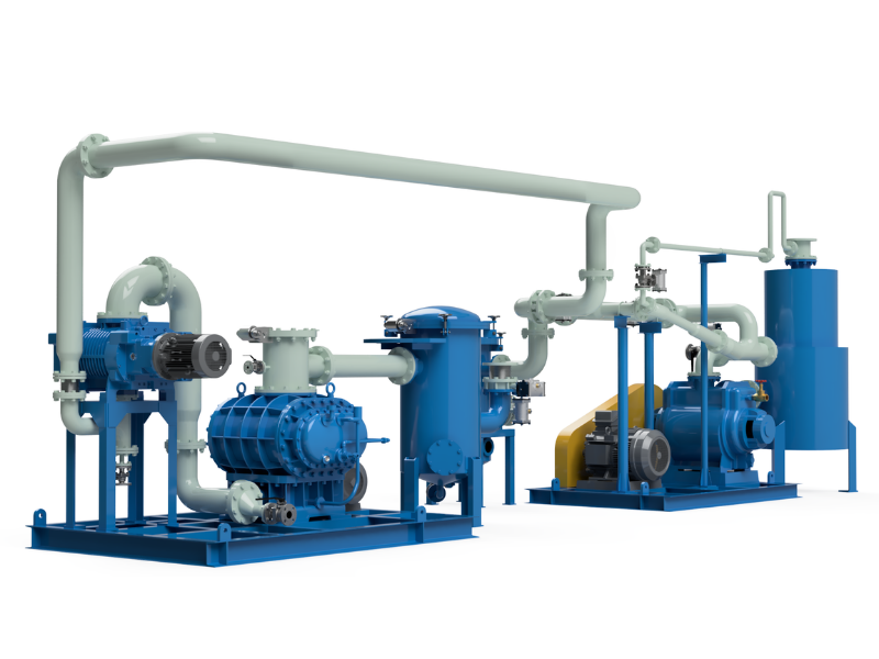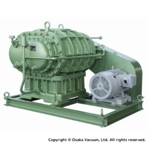 除膜処理装置はバッチ式装置で大気圧から目標圧力へと繰り返し排気が必要になるため、今回納入した真空排気装置では、主ポンプには大型のルーツ真空ポンプR6002RD2500を2段直列に使用し、大排気速度を実現することで短いサイクルタイムを可能にしています。またそれぞれがインバータ駆動させることで、高圧からの起動が可能なことも、短いサイクルタイムに寄与しています。