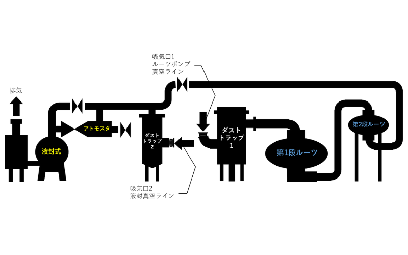 バッチ式装置での大気圧から目標圧力への繰り返し排気では、大気中の水分の吸引が問題になるため、真空排気装置の最終段補助ポンプには、水を含んだガスに強い液封式真空ポンプW1800Tを使用しています。液封式真空ポンプの前段側にはアトモスタ(空気エジェクタ)を取り付けて、より低い到達圧力を得ています。