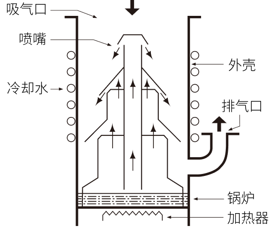 如图所示,油扩散泵由油锅、扩散喷嘴、汽缸三个部分组成 ,真空泵本身没有机械式的可动机构。 油扩散泵的排气原理如下:首先,油在油锅的部分被加热蒸发,大量的油分子从喷嘴倾斜地向下以超音速的速度被喷出。从高真空侧(吸气口)吸入的气体分子高几率的与喷出的油分子进行碰撞,被油分子一起被喷出与压缩到斜下方的空间内。如此反复至第二级,第三级,最后气体分子经排气口由前级泵抽出。 由喷嘴喷出的油分子与冷却的汽缸内壁进行碰撞,会产生冷凝,液化效果。最后,回到油锅内,再次被加热后从喷嘴喷出。 另外,油扩散真空泵并不能进行单独的排气,需要与前级泵(主要为滑阀真空泵)进行搭配后进行排气。