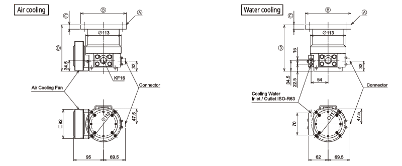 The base pressure is guaranteed only at ambient temperatures ranging from 10 to 23°C. The operating temperature range is 10 to 32°C for the air-cooling models and 10 to 40°C for the water-cooling models. The base pressure is only guaranteed at a water temperature of 30°C or below. The water temperature range is 10 to 35°C.