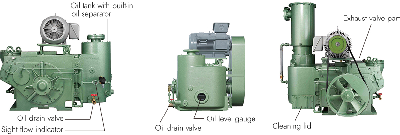 Osaka Vacuum’s oil-sealed rotary vacuum pumps can be operated under harsh operating conditions such as continuous operation in low vacuum ranges, and repeated short-term cycles at atmospheric pressure and vacuum. These pumps provide a long reliable lifetime when equipped with an appropriate oil supply mechanism.