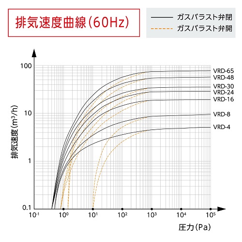ガスバラストガスの導入量を調節し、排気する気体に含まれる凝縮性ガス(水蒸気など)が油回転真空ポンプ内部で凝縮することの防止と到達圧力を両立します。(VRD-4・VRD-8は一段階)