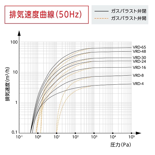 ガスバラストガスの導入量を調節し、排気する気体に含まれる凝縮性ガス(水蒸気など)が油回転真空ポンプ内部で凝縮することの防止と到達圧力を両立します。(VRD-4・VRD-8は一段階) - 強制油循環システムを搭載