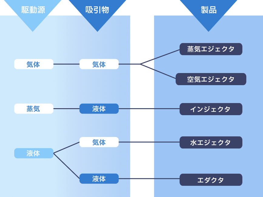 最も一般的な例としては、水蒸気を使用する「蒸気エジェクタ」があります。その他にも、用途にあわせて「空気」「水」などを駆動源に使用できます。また、耐蝕性材料を始め色々な材料による製作が可能です。(例:チタン)