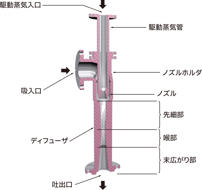 まず駆動蒸気(通常は0.25~1.6MPaGの乾き飽和水蒸気または微過熱水蒸気を供給する)はノズルを通過するとき、供給圧力から吸入室内の圧力まで圧力を減少させます(断熱膨張)。この圧力減少分は運動量に変わります。ノズル末広がり部を通過する事でさらに加速され超音速流となり、吸入室、ディフューザへ噴射します。