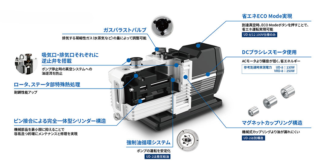 省エネECO Mode実現 → 到達真空時、ECOModeボタンを押すことで、省エネ運転実現可能(UD-8/12 100V仕様のみ)